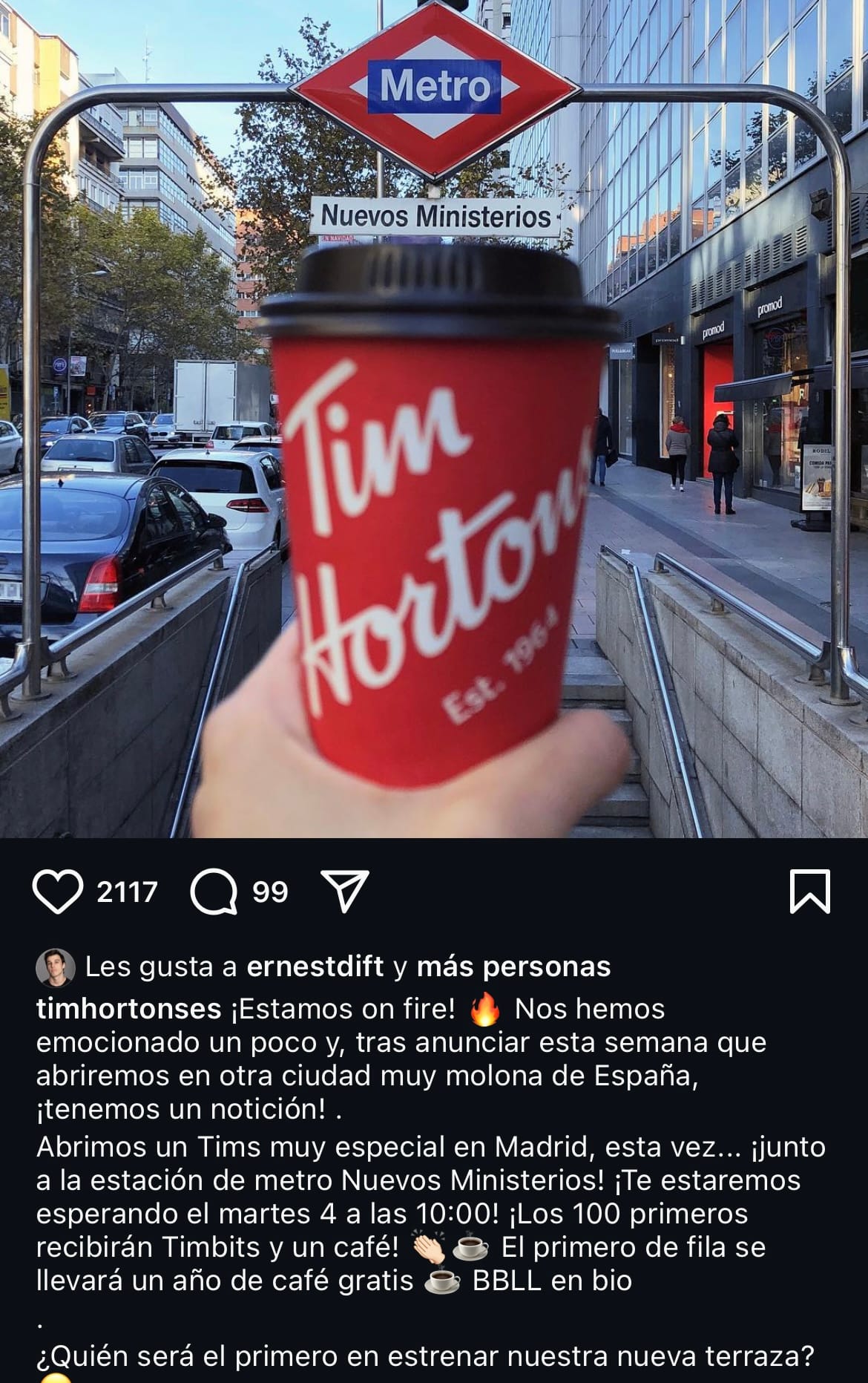 Tim Hortons, una cadena de cafetería canadiense, abre otro local en Madrid. Regalan café y bollo a los 100 primeros, y un año de café gratis al primero de la fila.