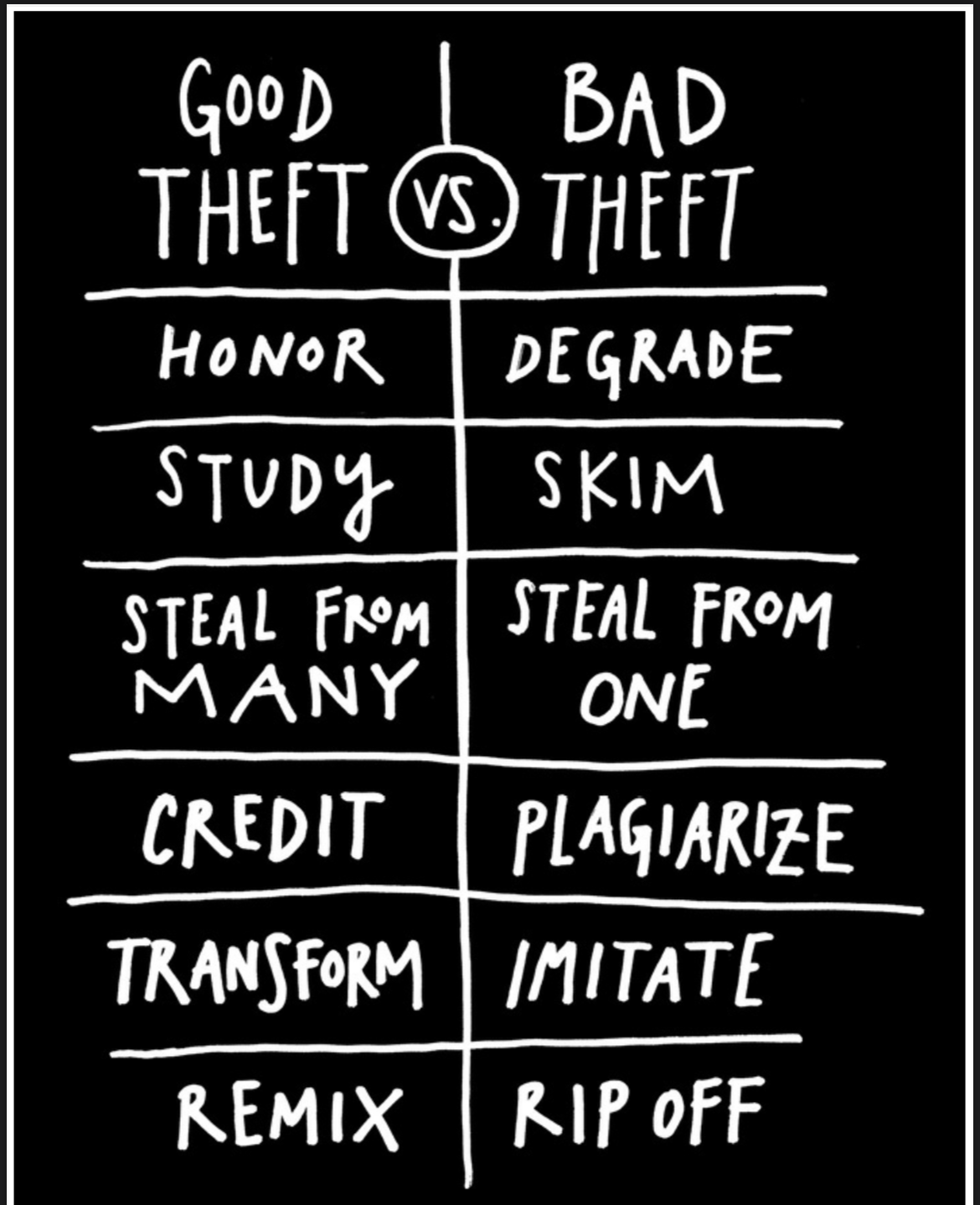 Pero la Biblia del creativo dice “No robarás por robar, lo harás para mejorar tu arte, y no lo harás solo a una persona, lo harás a varias, y les darás su crédito, y con ello su honor, pues el arte crece cuando de arte se nutre”